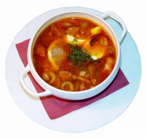 Солянка – это эргономичное и универсальное блюдо, к тому же, оно весьма сытное и достаточно калорийное. Солянку готовят как с колбасами и мясными продуктами, так и с рыбой, наряду с этим неизменными ингредиентами в обязательном порядке остаются маринованные огурцы, оливки и лимон.