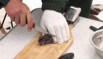 Пока в котелке греется вода, позаботьтесь о том, чтобы у вас все было под рукой. Не считая чистой посуды для изготовление ухи из налима вам пригодятся специи, мука, яйцо, одна луковица, не помешают соленые маслины, тёмный душистый перец, укроп, петрушка, лавровый лист, свежая или мороженая клюква. В то время, когда все это приготовлено возможно заниматься рыбой. Отпустите всех налимов, которые гарантировано выживут, и принимайтесь за роботу. Разделка налима дело не простое, без разделочного комплекта со особым зажимом для перчаток и рыбы, данный на первый взгляд, несложный процесс преобразовывается в мукой , поскольку удержать налима рукой на доске у вас врятли окажется. В случае если же в наличии имеется хотя бы одна перчатка и особая разделочная доска, то все намного упрощается. Зажимом фиксируете хвост рыбы и начинаете разделку. Потому, что чистить налима не требуется, то у рыбы голова и вынимаются внутренности. Конечно же разделочный нож кроме этого должен быть эргономичным и острым. В то время, когда рыба выпотрошена, необходимо отделить филе от костей, для этого мясо срезается с двух сторон от позвоночника рыбы. Это также не весьма легко по причине того, что рыба скользкая, и филейку весьма тяжело удержать рукой. Пока один занимается рыбой, кто-то может почистить морковь и картофель. В то время, когда на берегу подготавливается уха из налима, лишних рук не бывает, и каждая помощь всегда к месту и существенно активизирует процесс.
